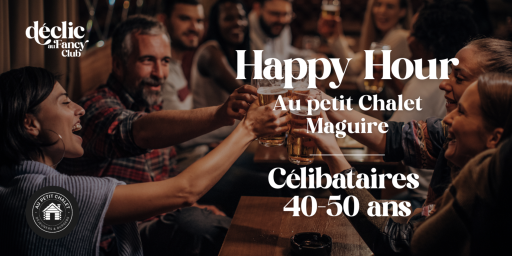 Rejoins-nous pour un Happy Hour convivial au Petit Chalet (rue Maguire), dans une ambiance chaleureuse et décontractée, typiquement Déclic au Fancy Club.