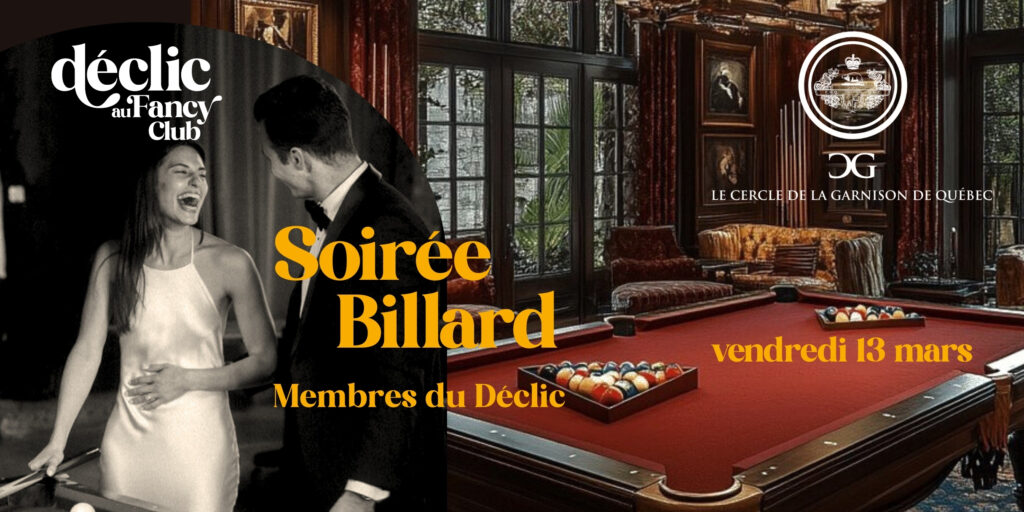 Le Cercle de la Garnison ouvre ses portes aux membres du Déclic pour une soirée privée au mythique Salon Lord Dufferin. Table de billard, ambiance feutrée et rencontres de qualité dans un lieu d’exception où peu de gens ont accès.